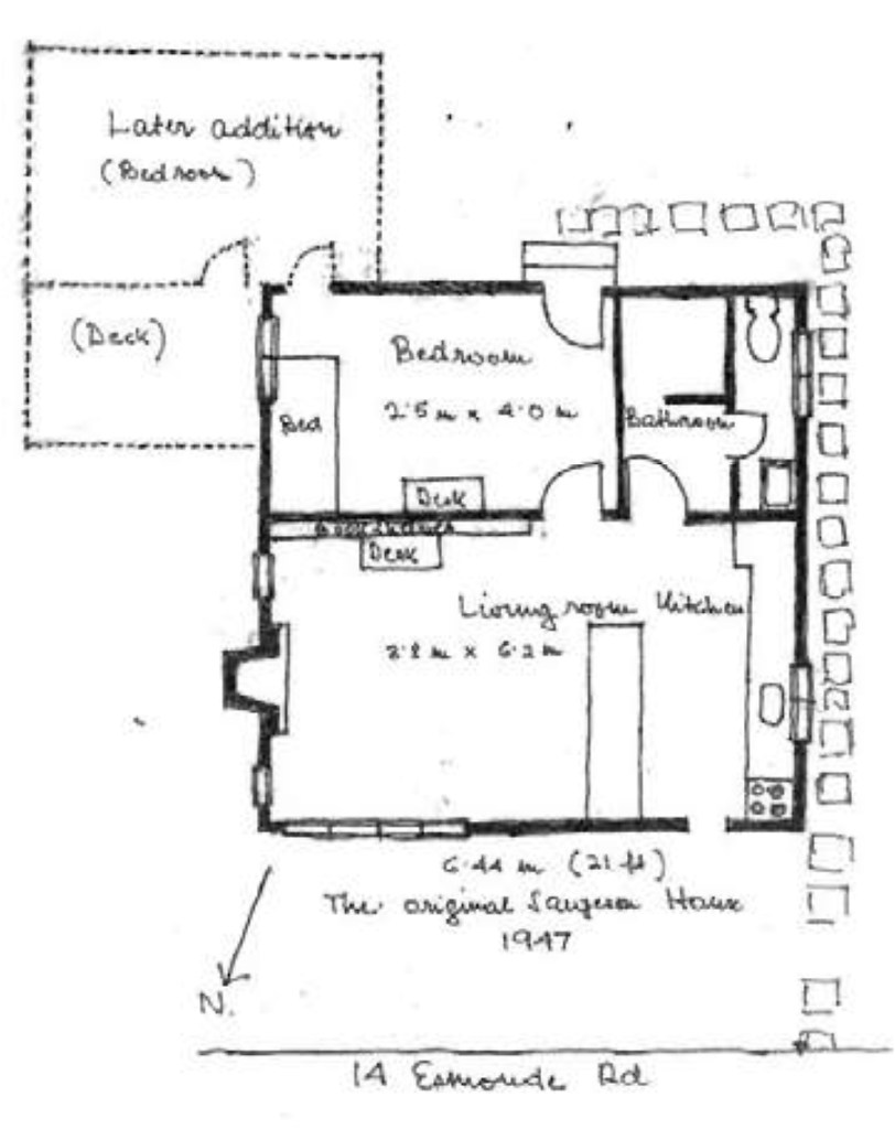 By the mid-1940s the old bach had become unfit to live in, and Sargeson began planning and raising money for a new structure on the property. In 1947 architect Vernon Brown prepared plans for a new dwelling but Sargeson did not like features such as the terrazzo bench (which he considered bourgeois). The cost of the building was also beyond his means. A simpler, more economical dwelling was designed by Sargeson’s friend George Haydn and constructed in 1948.