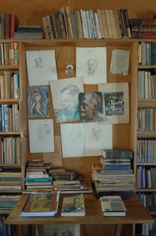 Haydn and Rollett also built some interior fittings. Bookshelves were built lining the wall facing Esmonde Road and with a table top (a wide shelf supported by brackets) fixed to the same wall between the bookshelves. Another such tabletop was fixed to the wall in Frank’s bedroom for him to work on. This became his favourite writing table. A kauri bench was constructed in the kitchen beside the tiny stove. Two divan beds were also built by Haydn and Rollett, one placed in the bed room and the other in the living room. A lamp was made from an empty Bushell’s coffee jar rinsed inside with paint and the lid fitted with a lamp. Writer Bob Gilbert, who had been in the Air Force, made a radio for Frank soon after the house was built. Drawings and paintings for the cottage were provided by John Graham and Keith Patterson. All of these things remain in the house except for the original kauri bench, which was replaced by Haydn and Rollett in 1996, and an oil painting of a cat by Patterson, which became too valuable to leave on the property and was sold in about 1993 to the Fletcher Gallery at the low price of $5000 to acknowledge the enormous help of Sir Hugh Fletcher in converting some old stables in Princes Street, central Auckland, into the Sargeson Centre.
